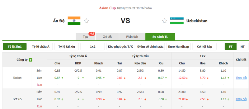 Tỷ lệ kèo trận đấu Ấn Độ vs Uzbekistan