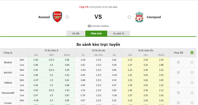 Tỷ lệ kèo trận đấu Arsenal vs Liverpool