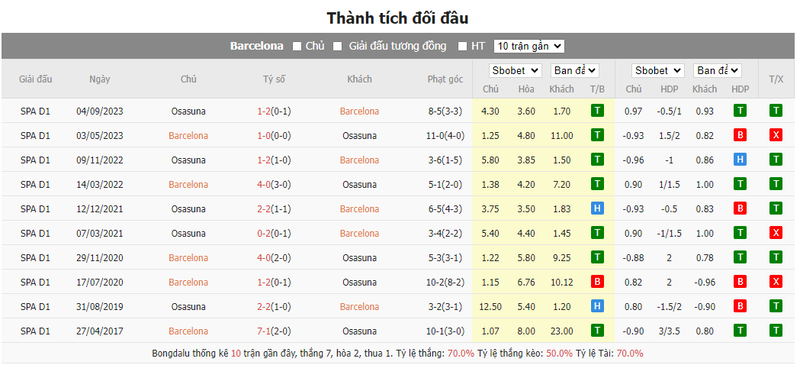 Đã có hơn 8,5 quả phạt góc ở 6 trên 7 trận gần đây của Barcelona. Đã có dưới 10,5 quả phạt góc ở 6 trên 7 trận gần nhất của Osasuna.