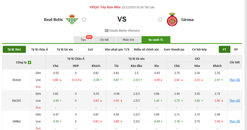 Tỷ lệ kèo trận đấu Betis vs Girona