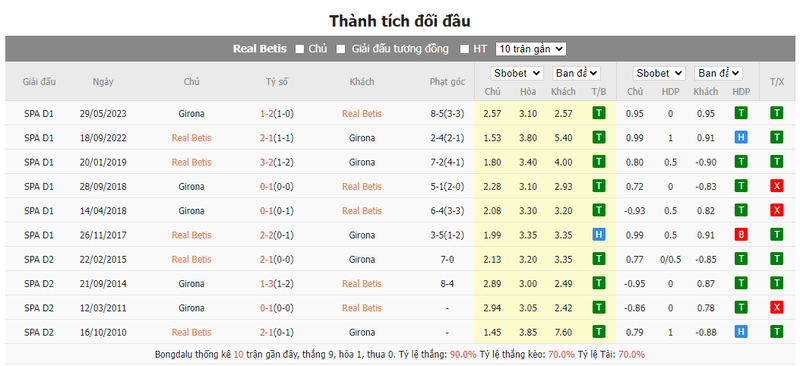 Đã có hơn 8,5 quả phạt góc được thực hiện trong 5 trận gần nhất của Real Betis tại La Liga và ở 8 trên 9 trận sân khách gần đây của Girona. Girona đã thực hiện dưới 4,5 quả phạt góc trong 5 trận La Liga gần đây của họ còn Real Betis đã thực hiện 4,5 quả phạt góc trong 6 trận sân nhà gần nhất tại La Liga.