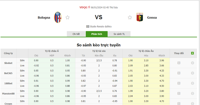 Tỷ lệ kèo trận đấu Bologna vs Genoa