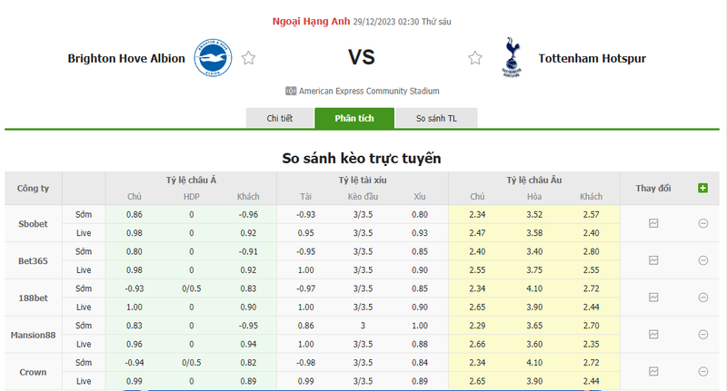 Tỷ lệ kèo trận đấu Brighton vs Tottenham