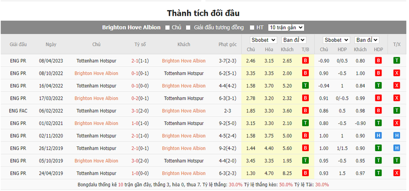 Có hơn 9,5 quả phạt góc được thực hiện trong 7 trận sân khách gần nhất của Tottenham Hotspur và ở 6 trên 7 trận gần đây của Tottenham Hotspur. Đã có dưới 11,5 quả phạt góc ở 14 trên 15 trận gần nhất của Brighton & Hove Albion tại Premier League.