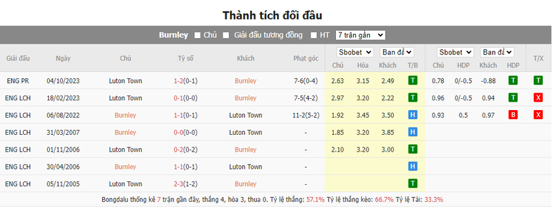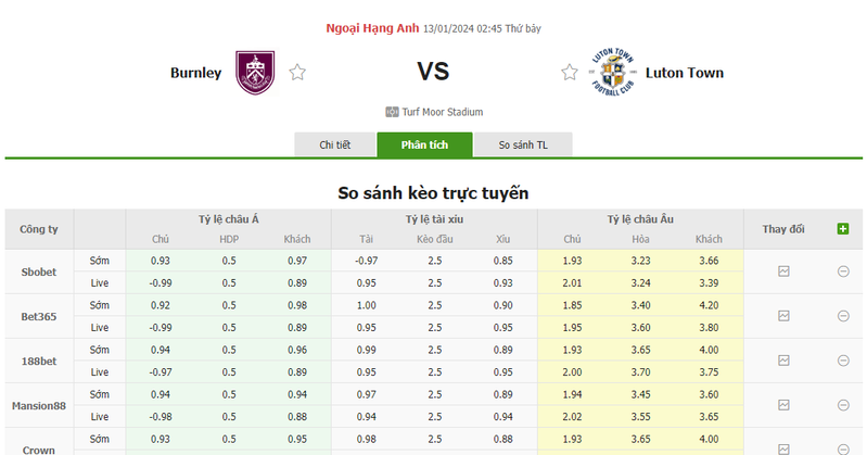 Tỷ lệ kèo trận đấu Burnley vs Luton Town