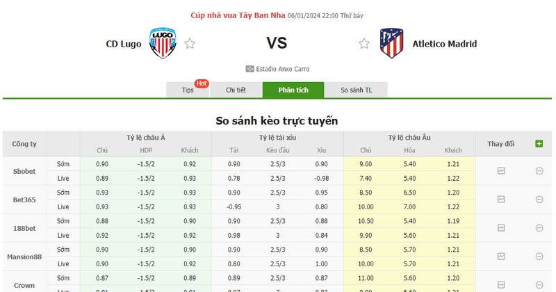 Đã có dưới 3,5 bàn thắng được ghi ở 24 trên 25 trận sân nhà gần nhất của Lugo. Đã có dưới 2,5 bàn thắng được ghi trong 7 trận gần đây của Lugo. Hàng thủ Atletico luôn chơi tốt dù trận thua gần nhất trước Girona (3:4). Và trước một Lugo yếu đuối, Madrid sẽ dễ dàng giành quyền vào vòng 1/8.