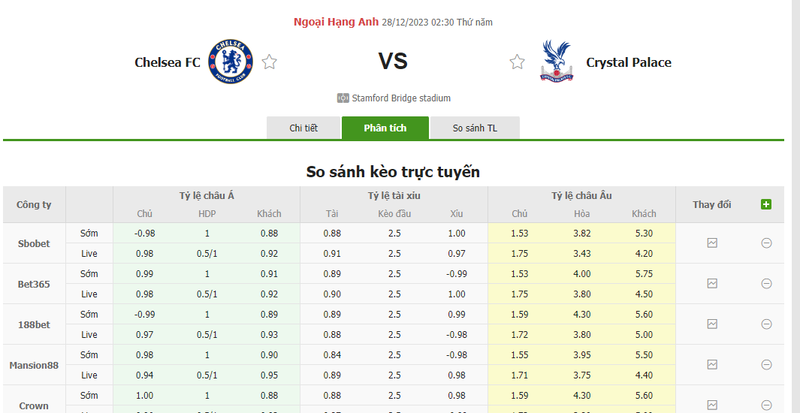 Tỷ lệ kèo trận đấu Chelsea vs Crystal Palace