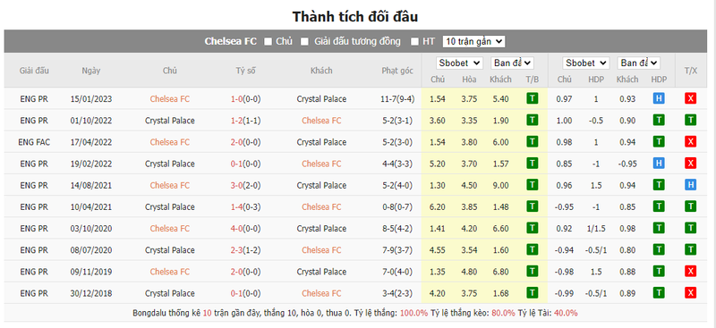 Có trung bình 9,65 quả phạt góc trong 20 trận gần nhất của Đại bàng và Chelsea xuất hiện trung bình 10,5 quả phạt góc trong 10 trận sân nhà gần đây. Palace có trung bình 10,3 quả phạt góc tại 10 trận sân khách gần nhất và có trung bình 10,4 quả phạt góc xuất hiện ở 20 trận gần đây mà Chelsea ra quân.