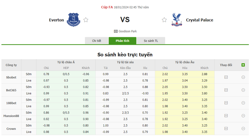 Tỷ lệ kèo trận đấu Everton vs Crystal Palace