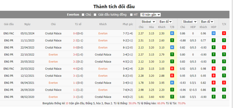 7 trận gần nhất mà Everton gặp Crystal Palace có tới 6 trận kết thúc trên 8,5 pha đá góc. Everton đã hưởng từ 5 quả phạt góc trở xuống ở 5 trận sân nhà gần đây.