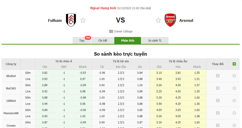 Tỷ lệ kèo trận đấu Fulham vs Arsenal