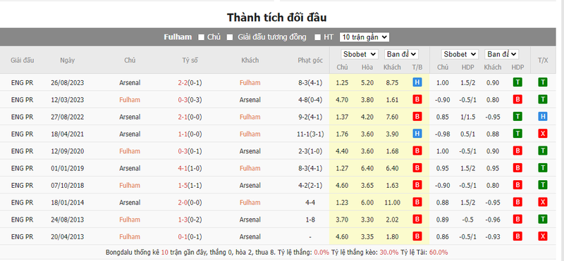 Fulham đã thực hiện dưới 4,5 quả phạt góc trong 7 trận gần nhất gặp Arsenal. Đã có dưới 11,5 quả phạt góc ở 8 trên 9 trận gần nhất của Fulham.