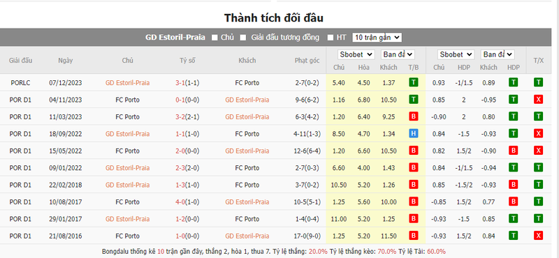 Porto đã thực hiện 5,5 quả phạt góc trong 6 trận gần nhất gặp Estoril Praia. Có hơn 8,5 quả phạt góc được thực hiện trong 6 trận gần nhất của Estoril Praia với Porto và tại 6 trận sân nhà gần nhất của Estoril Praia. Porto đã thực hiện dưới 6,5 quả phạt góc ở 7 trên 8 trận sân khách gần nhất.