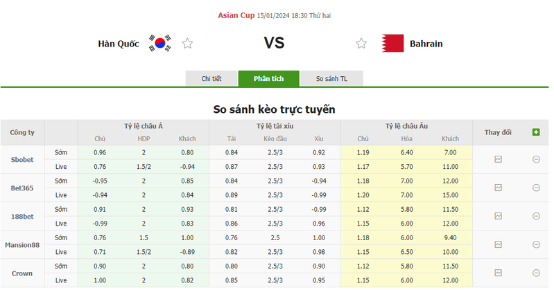 Tỷ lệ kèo trận đấu Hàn Quốc vs Bahrain