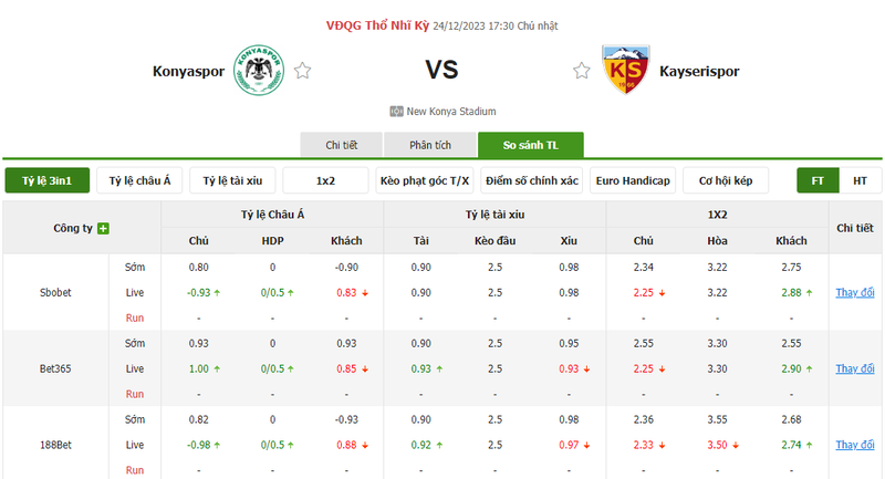 Tỷ lệ kèo trận đấu Konyaspor vs Kayserispor