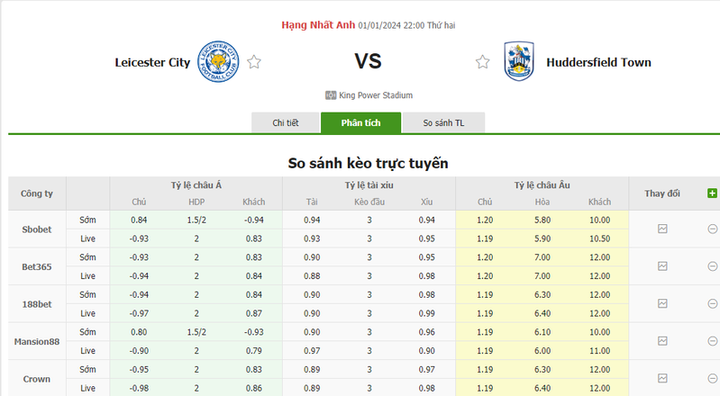 Tỷ lệ kèo trận đấu Leicester vs Huddersfield