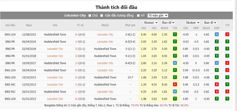 Leicester City đã thực hiện dưới 7,5 quả phạt góc trong 5 trận gần nhất gặp Huddersfield Town. Trung bình có 11,3 quả phạt góc trong 10 trận sân khách gần đây của Huddersfield. Còn Leicester có trung bình 10,2 quả phạt góc trong 10 trận sân nhà gần nhất.