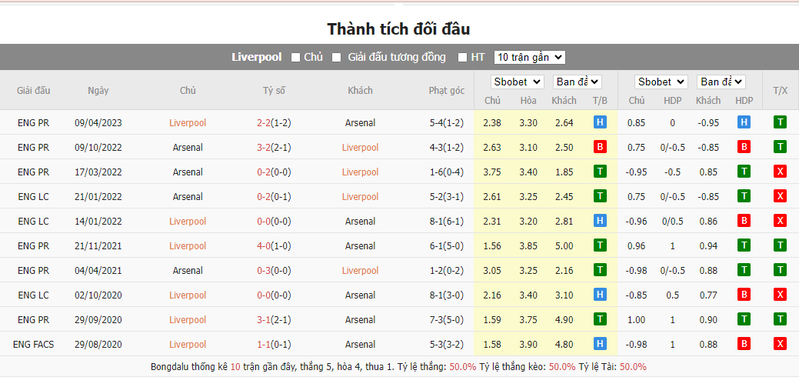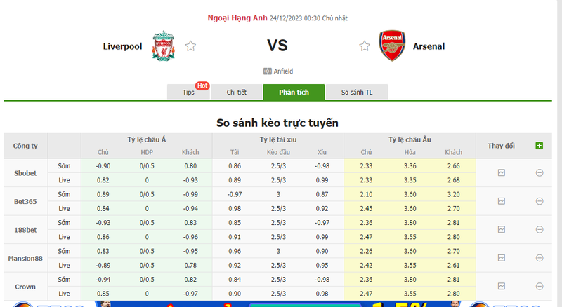 Tỷ lệ kèo trận đấu Liverpool vs Arsenal