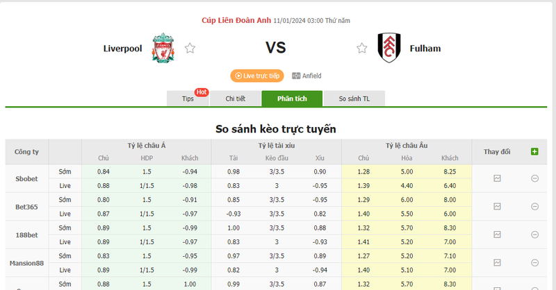 Tỷ lệ kèo trận đấu Liverpool vs Fulham