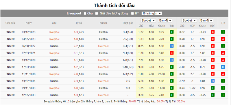 Đã có dưới 11,5 quả phạt góc trong 11 trận sân khách gần nhất của Fulham. Liverpool thì có 8 lần hết trận trên 9 pha đá góc tại 10 trận gần đây.