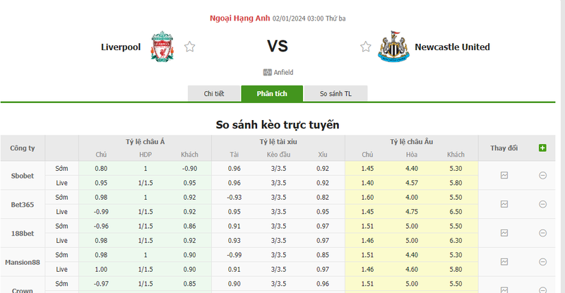 Tỷ lệ kèo trận đấu Liverpool vs Newcastle