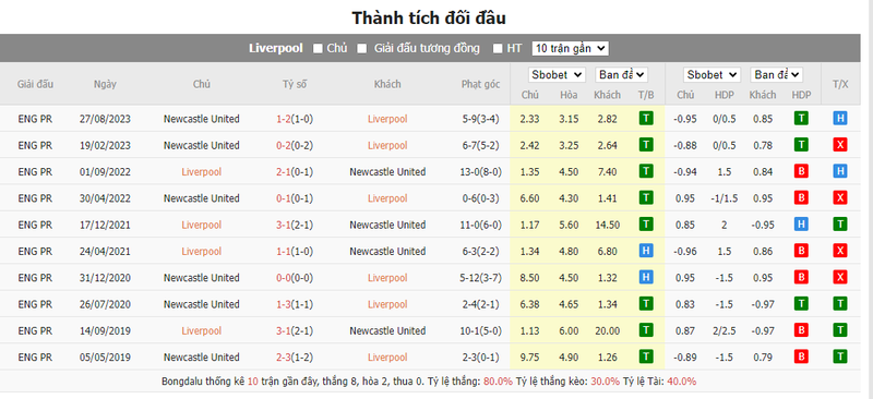 Liverpool có ít hơn 2,5 lần việt vị trong 5 trận sân nhà gần nhất gặp Newcastle United. Đã có dưới 4,5 thẻ vàng trong 5 trận gần đây của Liverpool gặp Newcastle United.