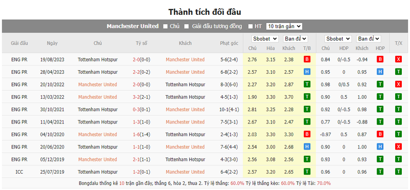 Tottenham Hotspur đã thực hiện dưới 5,5 quả phạt góc trong 7 trận sân khách gần nhất với Manchester United. Đã có dưới 12,5 quả phạt góc ở 6 trên 7 trận gần nhất của Manchester United với Tottenham Hotspur.