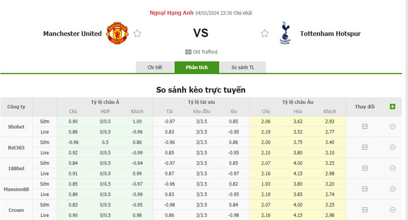 Tỷ lệ kèo trận đấu Man United vs Tottenham