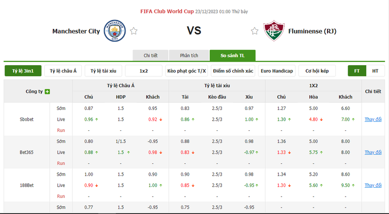 Tỷ lệ kèo trận đấu Manchester City vs Fluminense