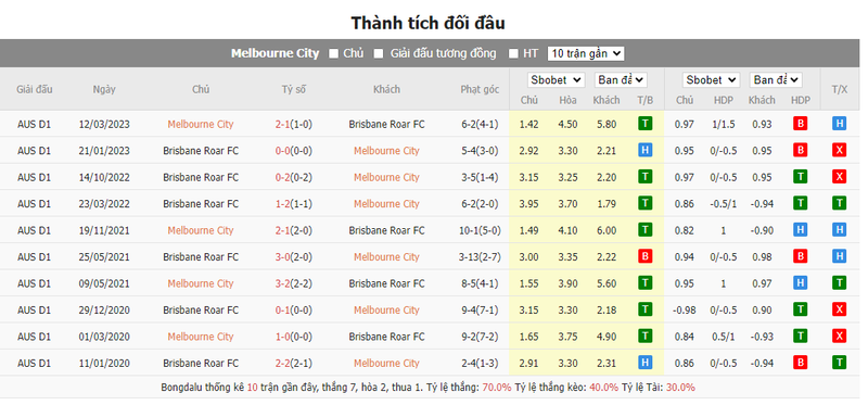 Melbourne City đã thực hiện 5,5 quả phạt góc trong 8 trận sân nhà gần nhất trước Brisbane Roar. Đã có hơn 9,5 quả phạt góc ở 7 trên 8 trận sân nhà gần nhất của Melbourne City gặp Brisbane Roar.