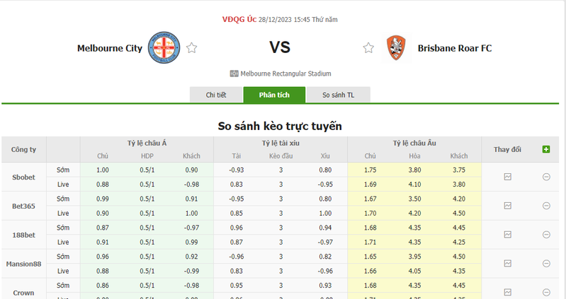 Tỷ lệ kèo trận đấu Melbourne City vs Brisbane Roar