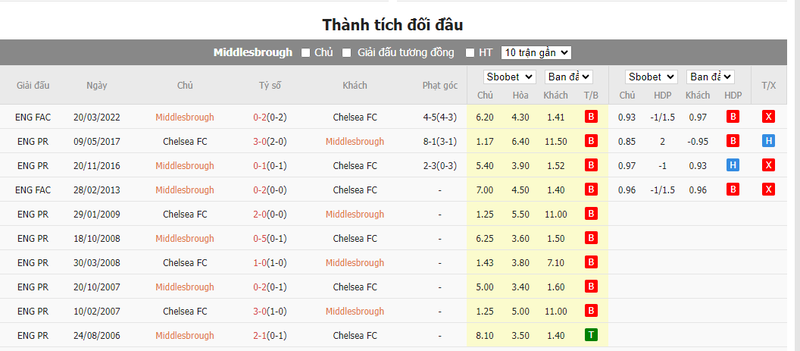 Tỷ lệ kèo trận đấu Middlesbrough vs Chelsea