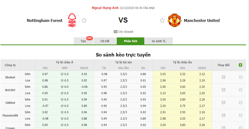 Tỷ lệ kèo trận đấu Nottingham vs Man United