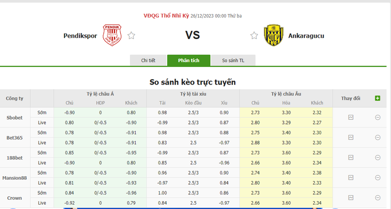Tỷ lệ kèo trận đấu Pendikspor vs Ankaragucu