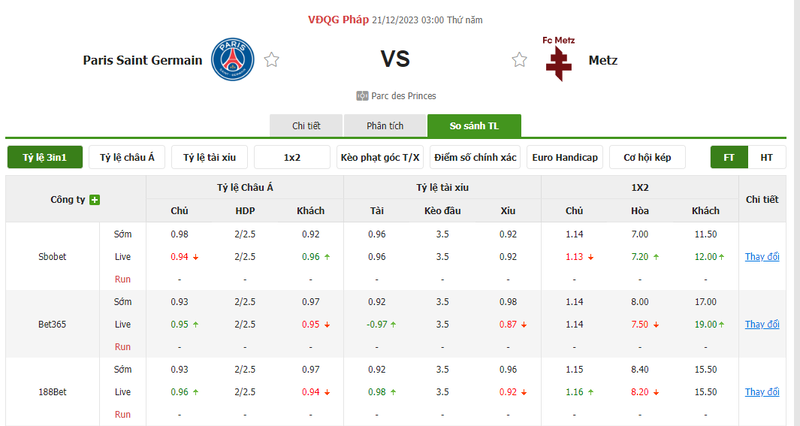 Tỷ lệ kèo trận đấu PSG vs Metz