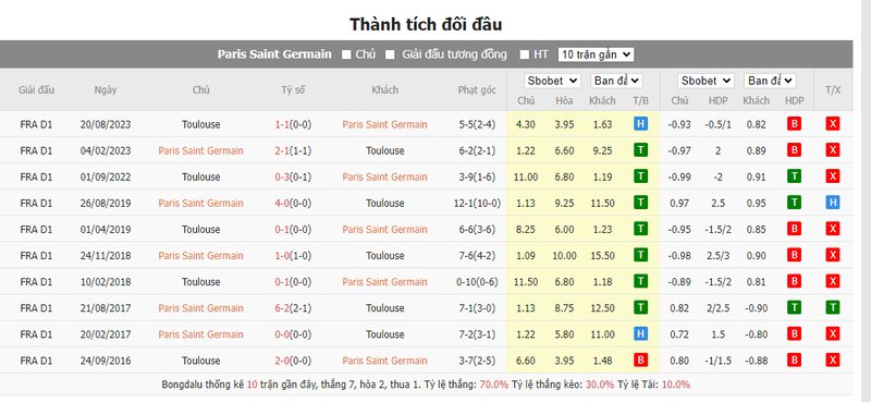 Đã có hơn 9,5 quả phạt góc ở 6 trên 7 trận gần nhất của Paris Saint-Germain với Toulouse. Paris Saint-Germain đã thực hiện 5,5 quả phạt góc ở 7 trên 8 trận gần đây đụng độ Toulouse. Đã có dưới 10,5 quả phạt góc ở 6 trên 7 trận sân khách gần nhất của Toulouse và trong 7 trận gần đây của họ. Paris Saint-Germain đã thực hiện dưới 6,5 quả phạt góc ở 7 trên 8 trận gần nhất.