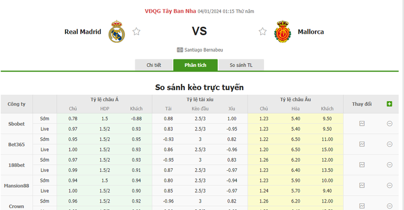 Tỷ lệ kèo trận đấu Real Madrid vs Mallorca