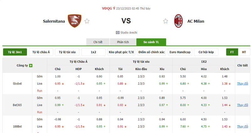 Tỷ lệ kèo trận đấu Salernitana vs AC Milan