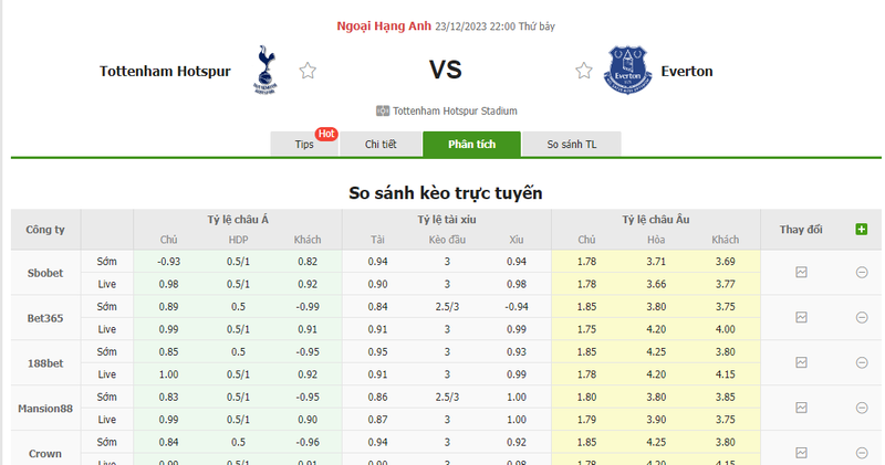 Tỷ lệ kèo trận đấu Tottenham vs Everton