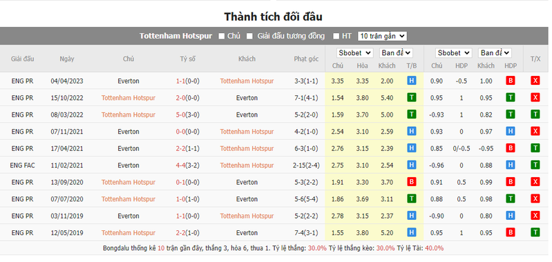 Tỷ số là 1-1 khi Tottenham đối đầu với Everton lần gần nhất trên sân Goodison Park. Trong 10 lần chạm trán vừa qua, chúng ta đã chứng kiến Tottenham giành chiến thắng 3 lần và Everton giành được 2 chiến thắng. 5 cuộc đụng độ còn lại giữa hai đội kết thúc với tỷ số hòa.