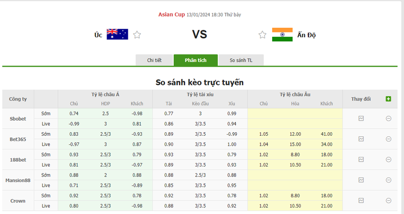 Tỷ lệ kèo trận đấu Úc vs Ấn Độ