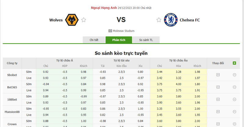 Tỷ lệ kèo trận đấu Wolves vs Chelsea